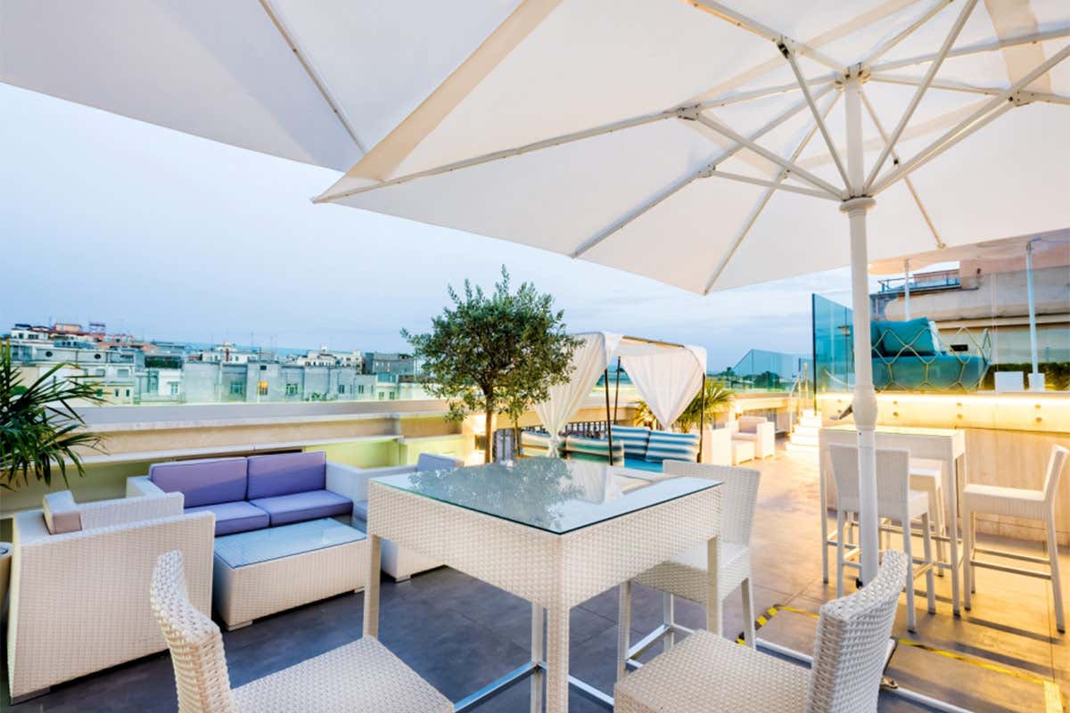 relax sulla Sky Blu Terrace dove tutto è organizzato per garantire agli ospiti la sicurezza necessaria e il massimo del comfort. Dopo una giornata immersi nella frenesia della città è il luogo ideale per rilassarsi, in una cornice moderna e scenografica, uno spazio perfetto per un pomeriggio di relax, ma anche per una informale