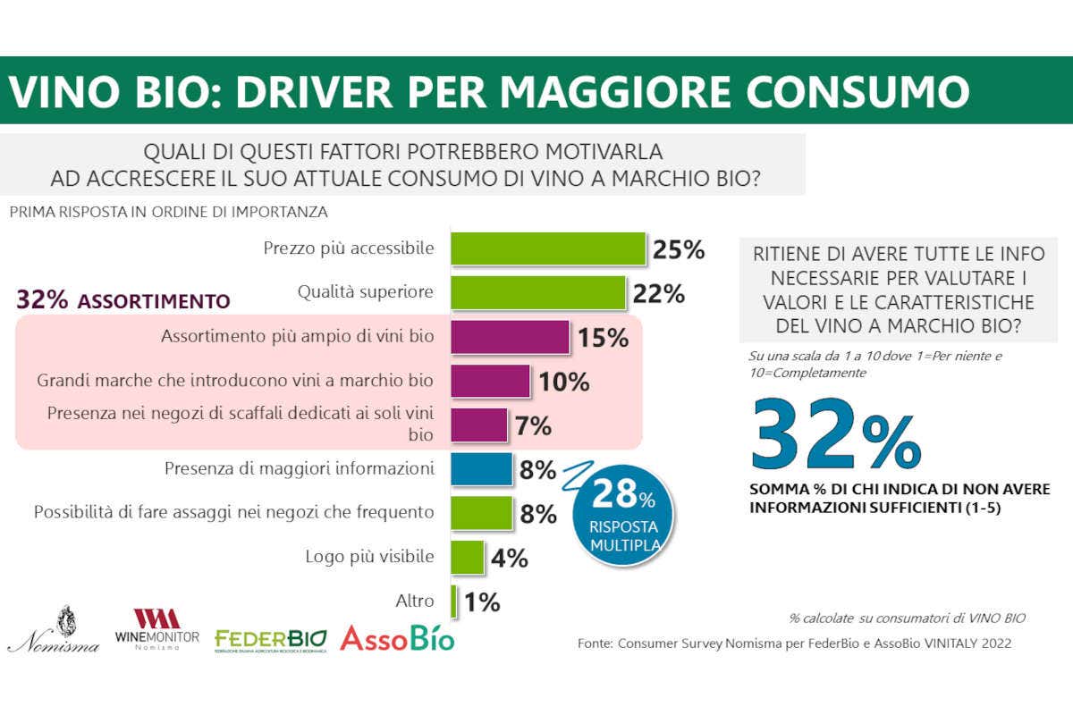 Silvia Zucconi - Responsabile Market Intelligence di Nomisma. «L’interesse del consumatore è chiaro: il 32% degli attuali wine user bio sarebbe intenzionato ad accrescere il consumo attuale se l’assortimento venisse ampliato (gamma più profonda, grandi marchi che introducono referenze a marchio bio oppure presenza nei negozi di scaffali dedicati ai soli prodotti bio). La richiesta di avere informazioni aggiuntive sul vino bio, indicata dal 54% dei non user – è indice di alto interesse nei confronti de vino bio». Un ulteriore fattore che emerge come potenziale stimolo al primo acquisto di vino bio è la possibilità di effettuare assaggi in negozio, indicato dal 14% degli attuali non users.