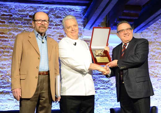 La consegna del Leone alla carriera a Iginio Massari, al centro; a sinistra Marcello Coronini; a destra Elio Dazzo, presidente dell'Aepe, Associazione esercenti pubblici esercizi di Venezia. Foto di Alice Ostan.14 chef stellati, i migliori pizzaioli, pasticceri e panificatori sono stati invitati da Coronini a proporre lo studio di due piatti, il loro piatto Firma e un piatto della grande tradizione italiana, secondo le regole de