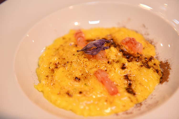Risotto Acquerello, zafferano, liquirizia, gambero rosso di Sanremo
