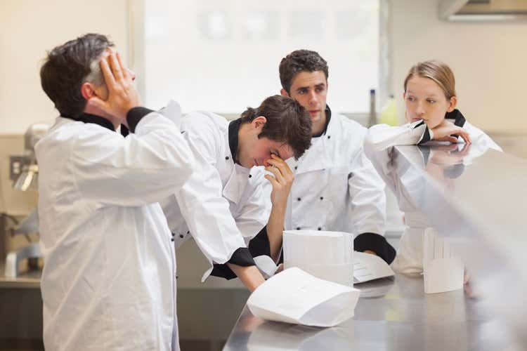 Una brigata di cucina in preda a un attacco di stress (Stress da lavoro al ristorante E lo psicologo entra in cucina)