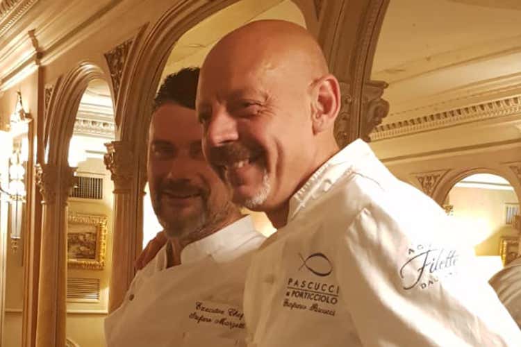 Stefano Marzetti, executive chef del Mirabelle, il ristorante con vista dell'Hotel Splendide Royal, ha accolto nella sua cucina lo chef Gianfranco Pascucci di Al Porticciolo di Fiumicino (Rm).