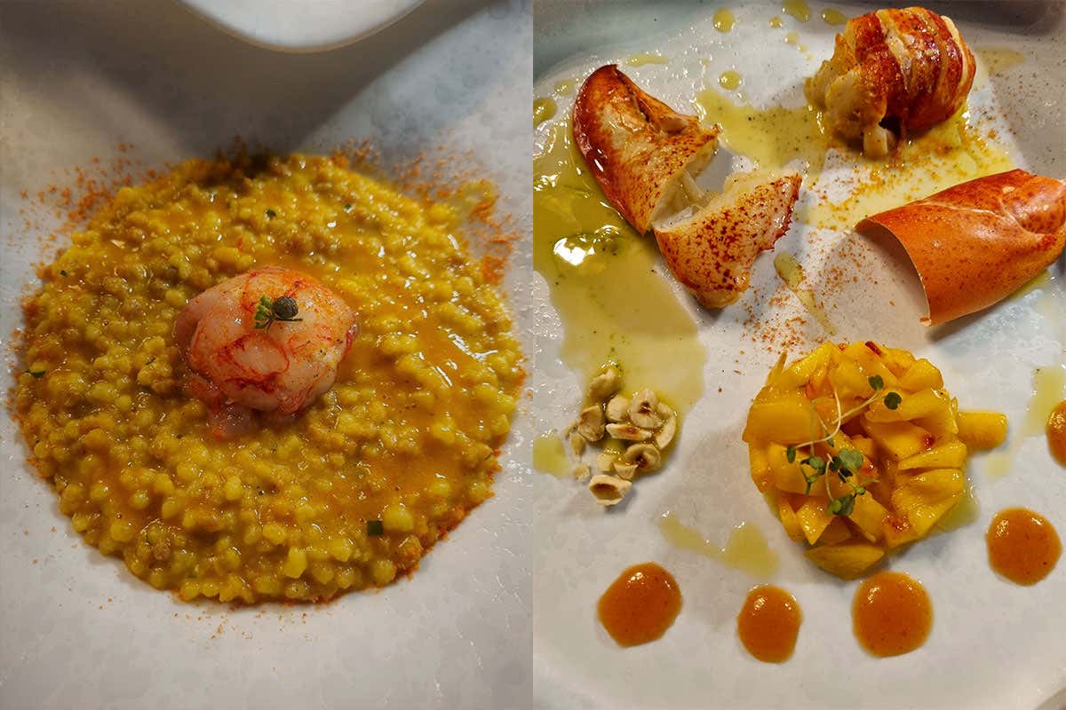 In occasione della serata dedicata alla Sardegna, sono stati preparati diversi piatti tipici dell’isola. Come antipasti sono stati proposti la sardina arrostita alle erbe e pecorino con pane, pomodoro ed olio al basilico, seguita dall’insalata di astice con pesche gialle, nocciole ed olio al lentischio. Non poteva mancare la fregula sarda, servita allo zafferano con sfera di gamberi rossi, mozzarella di bufala e olio ai crostacei, seguita dal branzino pescato croccante al finocchietto di mare, fumetto alle vongole, galletta di patate, cipolla e fungo porcino. Ha concluso la conviviale, abbinata ai vini della cantina Kellerei St. Pauls, il tipico dolce seadas con miele di corbezzolo, fichi caramellati e gelato alla vaniglia.