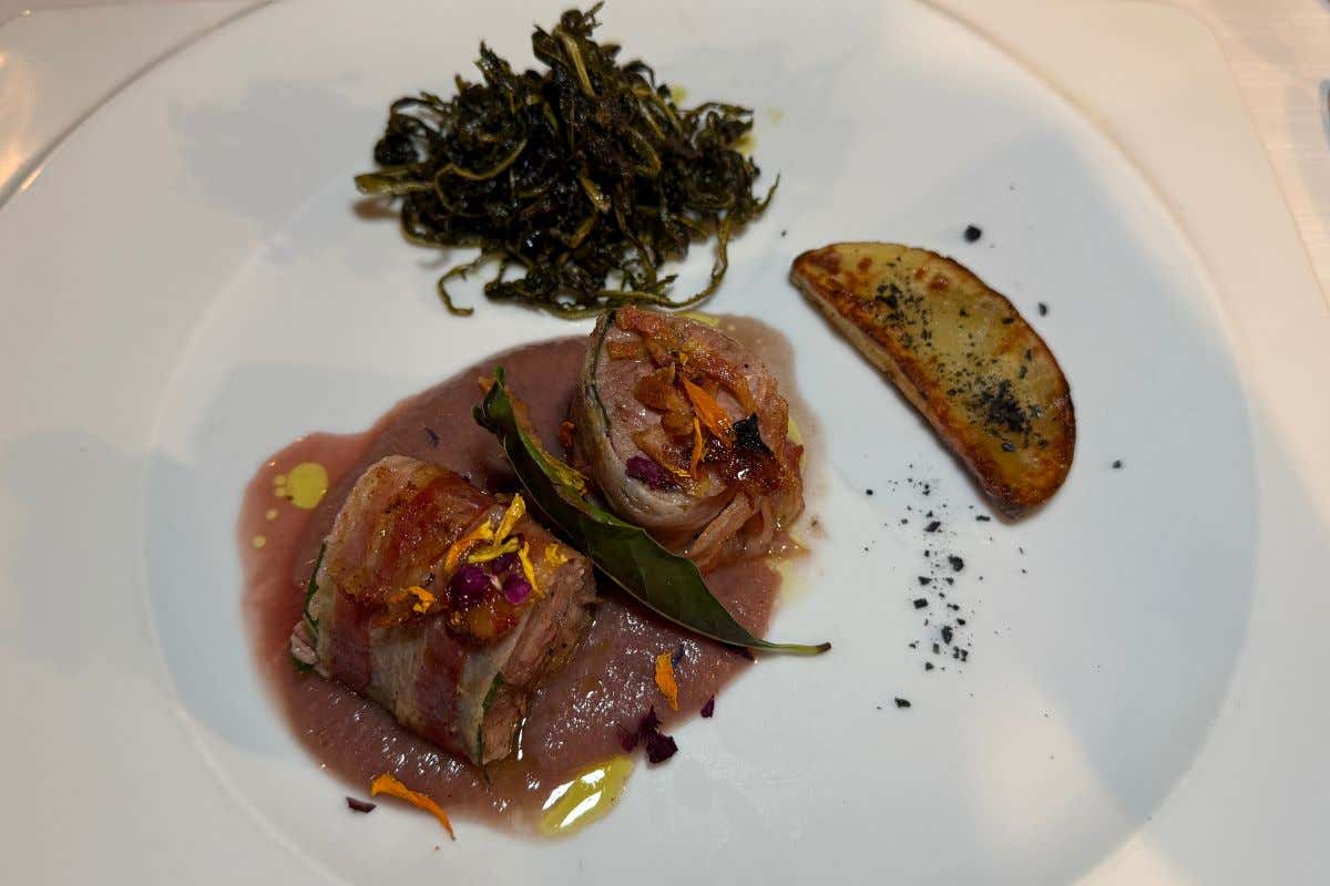 Filetto lardellato all'alloro, purea di pere, vino cotto e zenzero