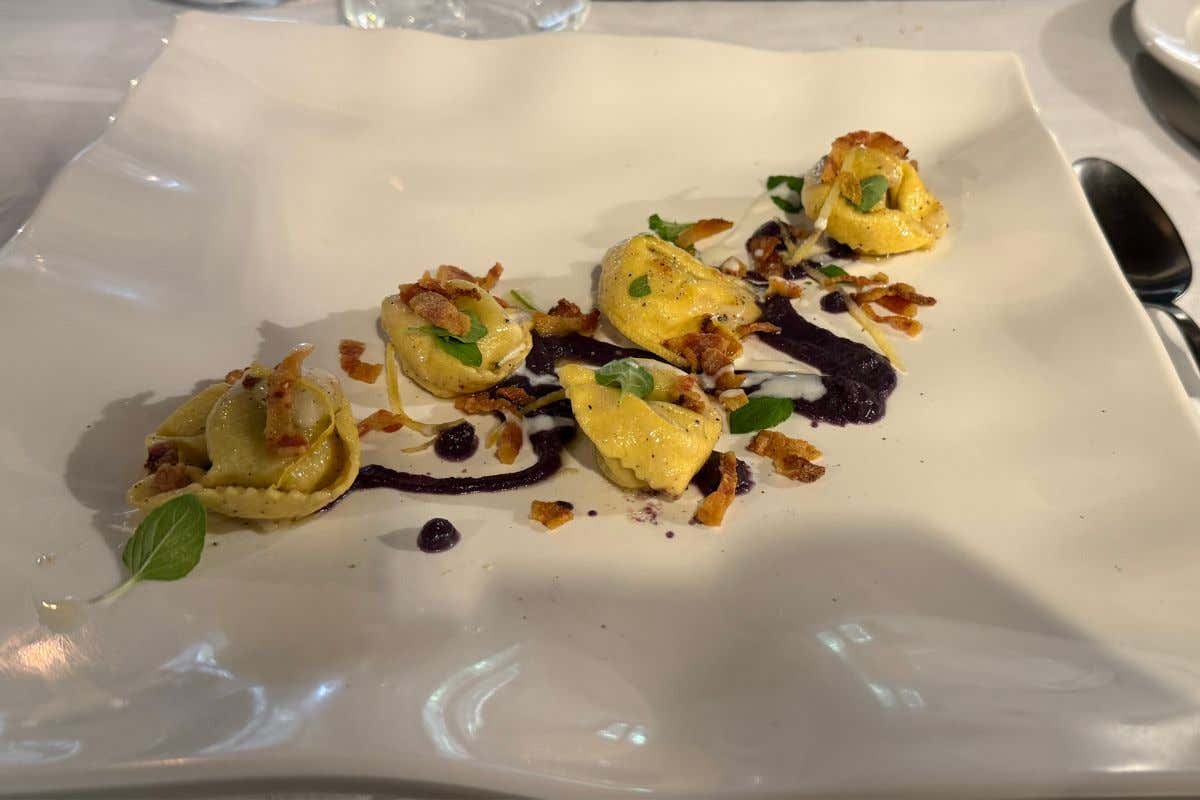 Tortelli ricotta e spinaci, amatriciana di cavolo viola, lime e mentuccia