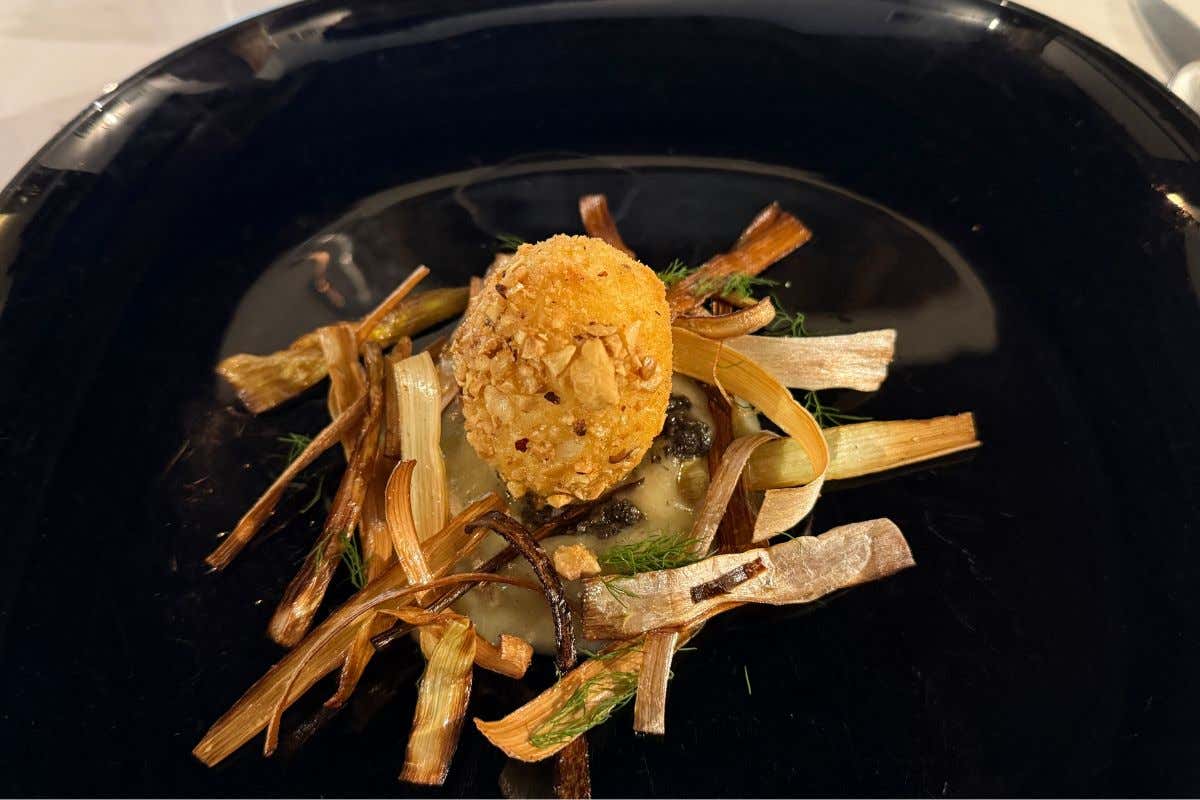 Uovo fritto con panatura alle nocciole, porro e tartufo