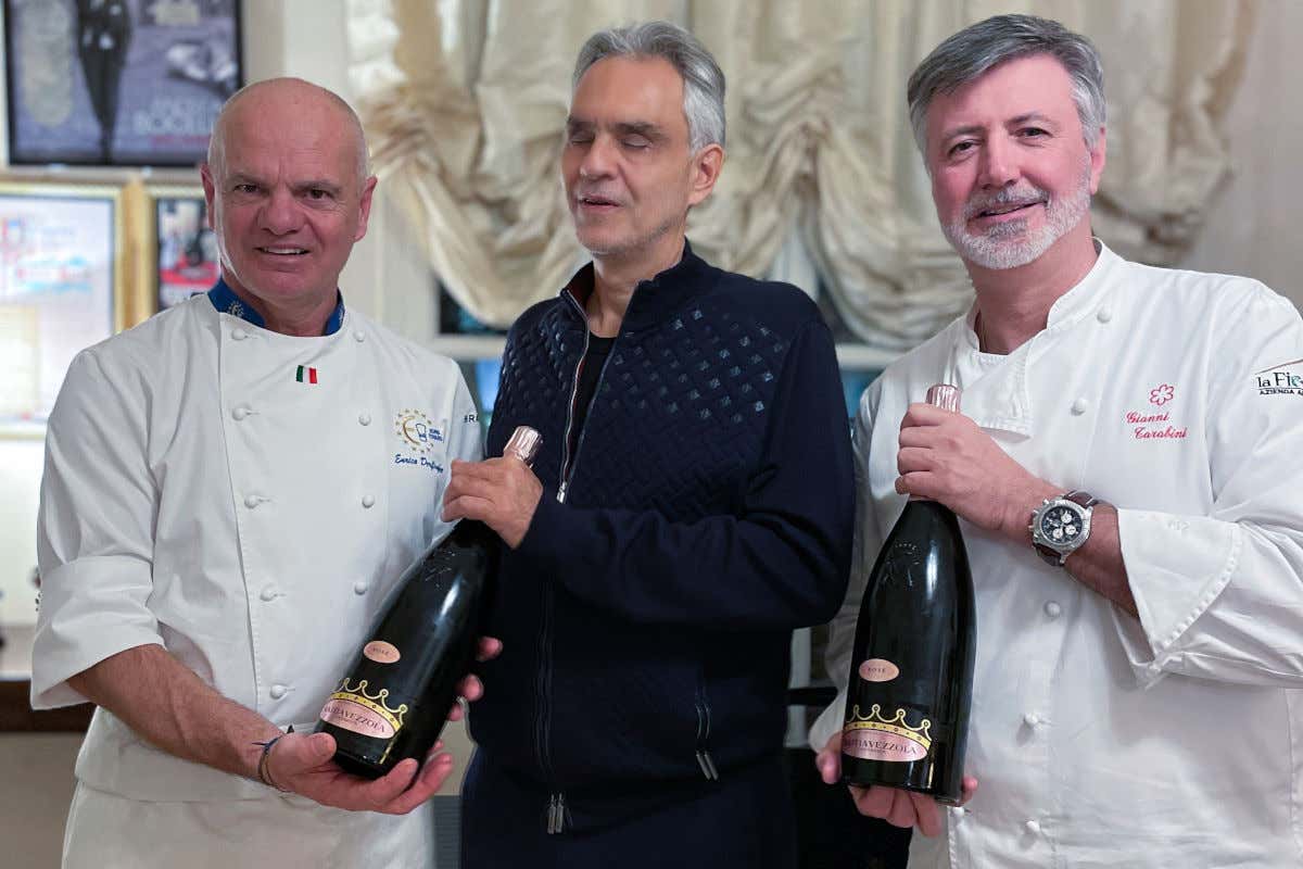Lo chef Tarabini e Andrea bocelli con una bottiglia dell'Azienda agricola Caven