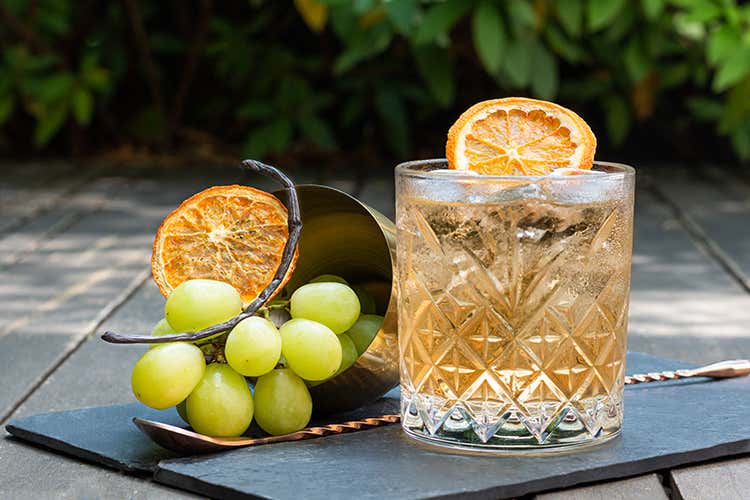 Mescolare il tutto in un tumbler basso di cristallo con ghiaccio cristallino, guarnire con una fettina di arancia disidratata.