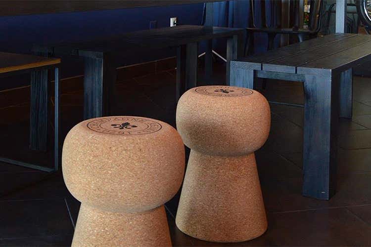 sgabello in sughero supercompresso a forma di tappo champagne. Un oggetto d’arte, ideale per arredare con gusto uno spazio in cui il vino è protagonista, che mette allegria ricordando un clima di festa. È caratterizzato da un design originale. Resistente, morbido e indeformabile, è realizzato interamente in