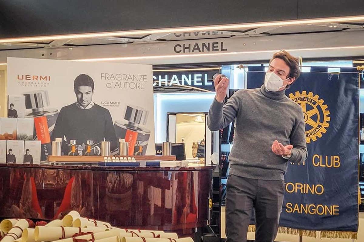 Abbiamo parlato con Luca Maffei, uno dei più importanti giovani creatori di profumi italiani, in occasione della presentazione presso la profumeria Sinatra di Torino di due fragranze di profumeria artistica che ha realizzato per Uermi Guardaroba olfattivo, un progetto interamente Made in Italy. Maffei, studi a Grasse, autore di capolavori olfattivi, lavora attualmente come maestro profumiere presso Afm Atelier Fragranze Milano. Partendo dal progetto di Uermi (il nome prende spunto dalla fonetica di Wear-me, vale a dire Indossami!), ovvero quello di dare un profumo ai tessuti che non hanno odore, Maffei ha interpretato l’idea di una percezione tattile del velluto con Ve Velvet e della pella con Nu Leather. Nel raccontare il percorso di realizzazione, ha messo in evidenza l’importanza della zona di origine della materia prima. Il Vetiver proveniente da Haiti ha un profilo olfattivo più verde con qualche tocco agrumato e morbido, mentre quello di Java ricorda il legno affumicato, la terra asciutta, quasi minerale. Altra affinità con il mondo del vino, l’importanza del territorio di origine. Ed ancora ci racconta che l’olio essenziale di bergamotto viene estratto solo dalla pianta che cresce in Calabria, proprio per le sue note olfattive originali.