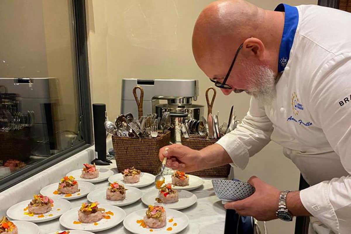 In cucina, Antonino Fratello, delegato Euro-Toques del Lazio che ha preparato due piatti di pesce e uno di carne che esaltassero gli oli utilizzati.
