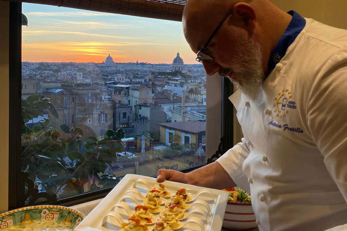 Come tutti i martedì, gli ospiti sono stati accolti da un aperitivo a base dei prodotti dell’Azienda Agricola Scovaventi, gustati di fronte al tramonto mozzafiato che ha avvolto tutta la città eterna.