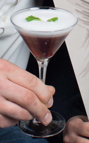 Cin Cin, di Flavio Esposito del bar Boutique di Milano, secondo classificato nel sondaggio di Italia a Tavola, categoria barman, ha presentato un cocktail after dinner di natura più tradizionale ma con delle varianti di ricerca, con liquore alla menta bianca e del gin Alkemist, a cui ha saputo unire del liquore Chamboard (ai lamponi) e del pompelmo rosa. Aromaticità intensa che necessitava di una certa meditazione per comprenderne bene il gusto. Simpatica l’idea ci completare il drink con una aria aromatica sulla sua superficie.