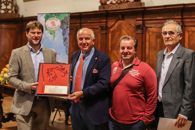 Matteo Giacomoni, vicesindaco di Bagnacavallo, Morello Pecchioli, Daniele Longanesi, presidente del Consorzio Bagnacavallo, e l'enologo Sergio Ragazzini (foto: Ortombina)