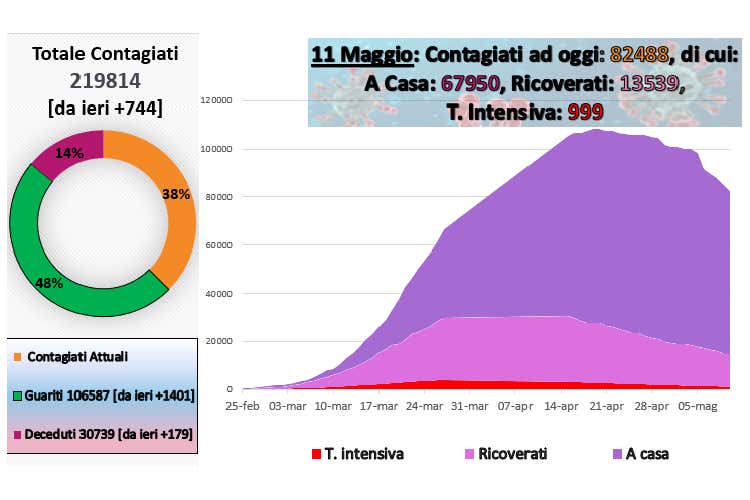 In Italia le persone complessivamente risultate positive al coronavirus, compresi guariti e deceduti, sono 219.814. Le vittime, in totale, sono 30.739, con un incremento di 179 decessi rispetto a ieri. Le persone attualmente positive sono 82.488. Le persone guarite nelle ultime 24 ore sono 1.401, per un totale di 106.587. Continua il calo dei pazienti in terapia intensiva: sono 999, 28 in meno rispetto a ieri. Il dato è in calo per il trentasettesimo giorno consecutivo. Dei pazienti attualmente positivi, 13.539 sono poi ricoverati con sintomi e 67.950 sono in isolamento domiciliare.