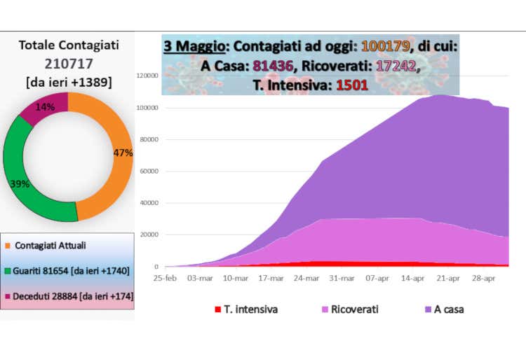 Cala ancora il numero dei malati. Sono scesi a 100.179, con un decremento di 525 persone (ieri erano stati -239 i malati rispetto al giorno precedente). Il dato è stato fornito dalla Protezione civile. Sono 81.654 i guariti dal coronavirus in Italia, con un incremento di 1.740 rispetto a ieri. Non si arresta l'ormai stabile trend in calo dei ricoveri in terapia intensiva per coronavirus: ad oggi sono 1.501, 38 in meno rispetto a ieri. Aumenta, a sorpresa, dopo una lunga striscia positiva, il numero dei ricoverati per coronavirus in Lombardia. Oggi ne sono stati registrati +80 contro i -99 di ieri e i -206 del giorno precedente. In ospedale restano quindi 6.609 persone mentre si conferma il calo nelle terapie intensive: 532 complessivamente i ricoverati, oggi -13.