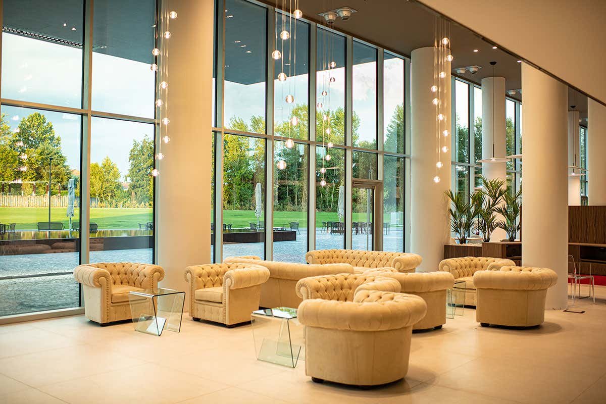 Sulla parte frontale dell’edificio spicca un aggetto strutturalmente sostenuto da un sistema ad arco e posteso, da cui sgorga la tenda d’acqua più grande d’Italia con funzione decorativa e di privacy. Nel nome della sicurezza resa necessaria dalla pandemia e nel rispetto del design e dell’estetica sono infine gli interni, rivoluzionati nella fruizione degli spazi e nei flussi di transito degli ospiti.