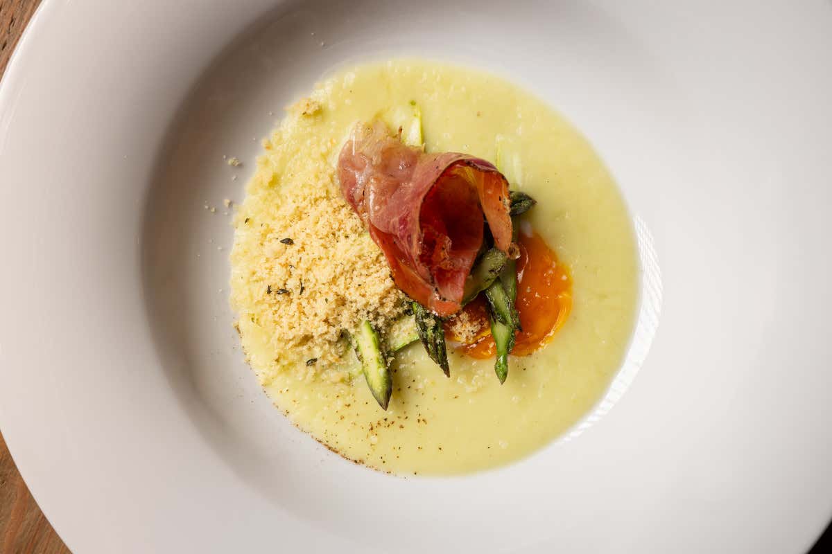 Uovo cotto a 63°, crema di patate e asparagi, e speck