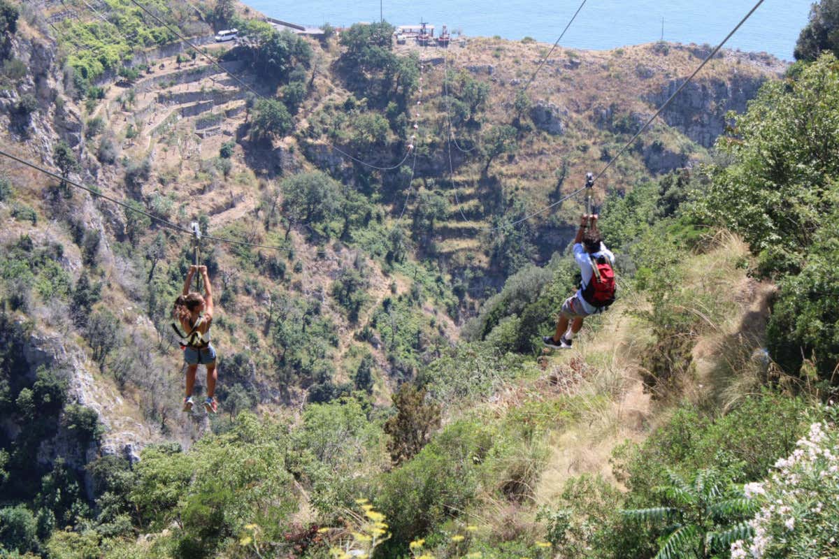 Si parte dalla località di Schiato, nel comune di Furore, per arrivare in località Punta Tavola scivolando gradatamente verso il mare lungo l’impianto della Zip Line, agganciati totalmente in sicurezza ad un’apposita imbracatura e a un cavo di acciaio. E’ un'attività adatta a tutti, che non richiede nessuna capacità specifica. Uniche accortezze quella di essere in buona salute e di non superare il 120 kg di peso per il volo in due. Tutta l’attrezzatura necessaria viene fornita dallo staff, che provvede anche ad occhialini protettivi consigliati per chi utilizza lenti a contatto Il volo, che si può effettuare da soli, in coppia o anche in parallelo, si protrae per 650 metri e permette di godere di uno dei panorami più affascinanti al mondo: non è un caso, infatti, che questo tratto di Costiera Amalfitana sia chiamato La Divina per la sua incredibile bellezza. In prossimità dell’arrivo la corsa rallenta dolcemente fino a fermarsi. L’esperienza si conclude con la sosta al belvedere situato alla partenza, facilmente raggiungibile in navetta, che permette di affacciarsi sul Golfo e continuare e ad ammirare tutte le meraviglie paesaggistiche circostanti, con una veduta che spazia a 360° dal capo di Agropoli fino ad Amalfi e Capri.