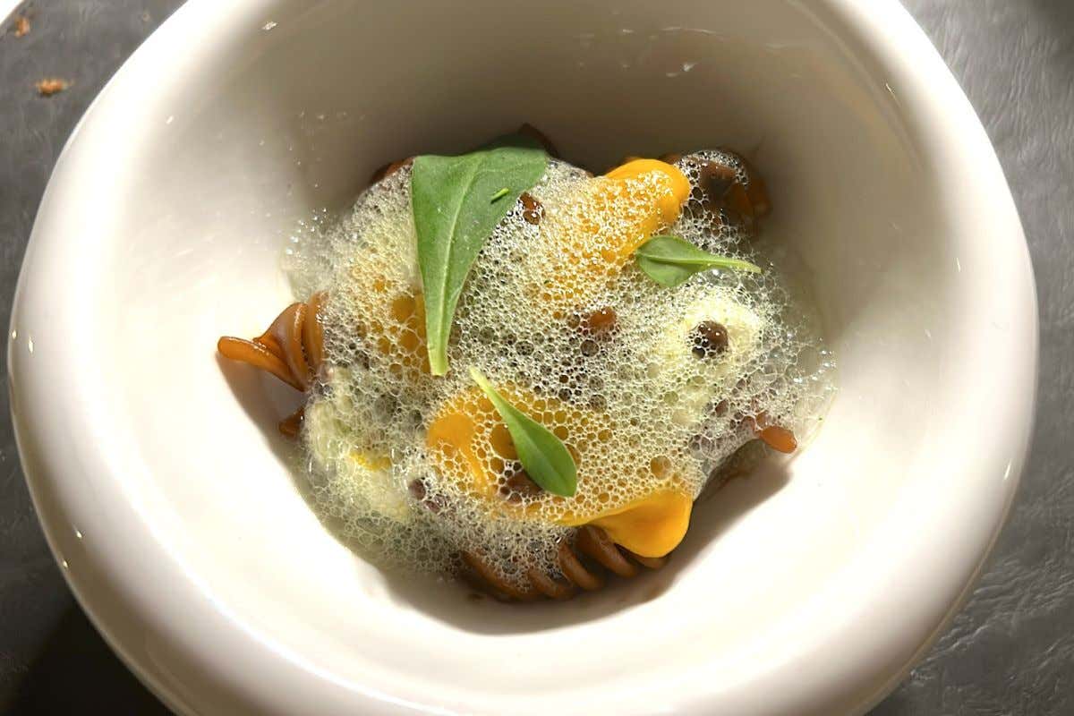 Ogni piatto rappresenta una celebrazione del territorio, rispettando la sostenibilità e valorizzando le eccellenze locali. Questo approccio permette a “La Cucina di San Pietro a Pettine” di offrire piacevoli esperienze gastronomiche in cui il noto (e spesso abusato) fungo ipogeo trova una bella esaltazione generale. Cosa si mangia quindi? Disponibile sia la carta sia il menu degustazione, con la possibilità di abbinare un wine pairing da 3 o da 5 calici. In una sala elegante, che a uno stile contemporaneo abbina anche tratti rustici testimoni del passato di una struttura che fu nel Medioevo refettorio di frati di clausura, carni e verdure si alternano in un piacevole valzer. Si comincia con il Coniglio d’autunno, accompagnato da erbe di campo, funghi e more, per poi proseguire con un mix di finocchio e anguilla esaltato dalla presenza di tartufo uncinato. Molto buoni i fusilloni alla zucca con caccialepre (erba selvatica) e yogurt di mandorla ma il confronto tra i due primi piatti va al Pincisgrass (conosciuto, specialmente nelle Marche, come Vincisgrasso), un cannolo al forno in bianco ripieno di fegatini di pollo, topinambur e con tartufo nero pregiato. Per gusti personali convince un po’ meno l’agnello con verza, ricotta di pecora, mentre il saluto finale della chef è affidato a un dessert che combina nocciola, gianduia e lingotto al cacao con tartufo nero pregiato.