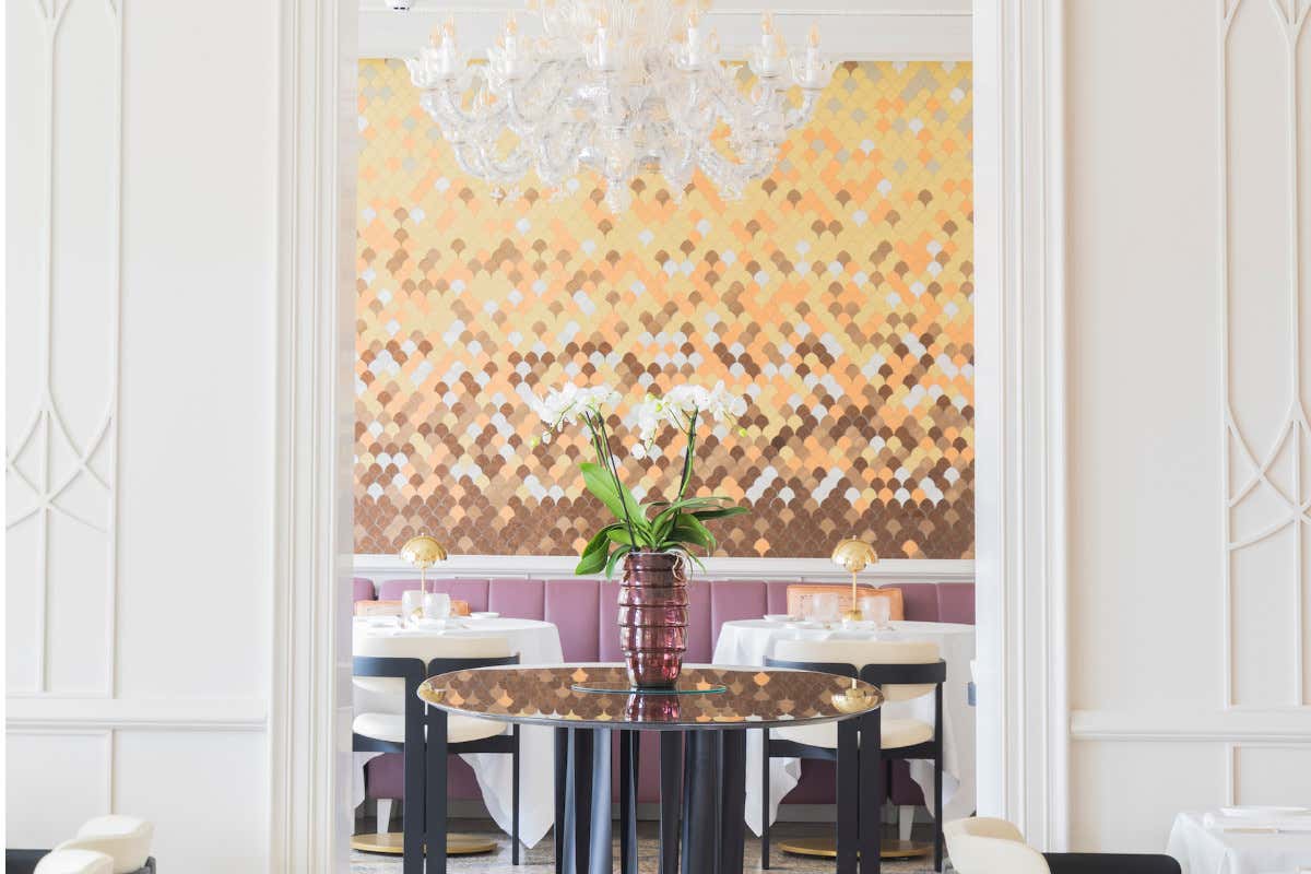 Tessuti e mosaici rifrangono l'inconfondibile luce di Venezia, grazie all'elegante palette declinata nelle sfumature dell'oro, rosa, bronzo e del rame. Tra gli arredi diventano protagonisti il grande tavolo nero “Boboli” di Cassina e le sedute di Gallotti e Radice.