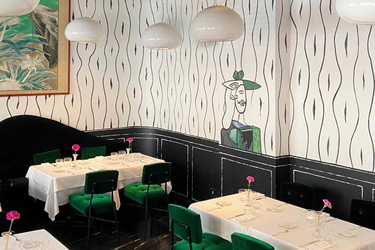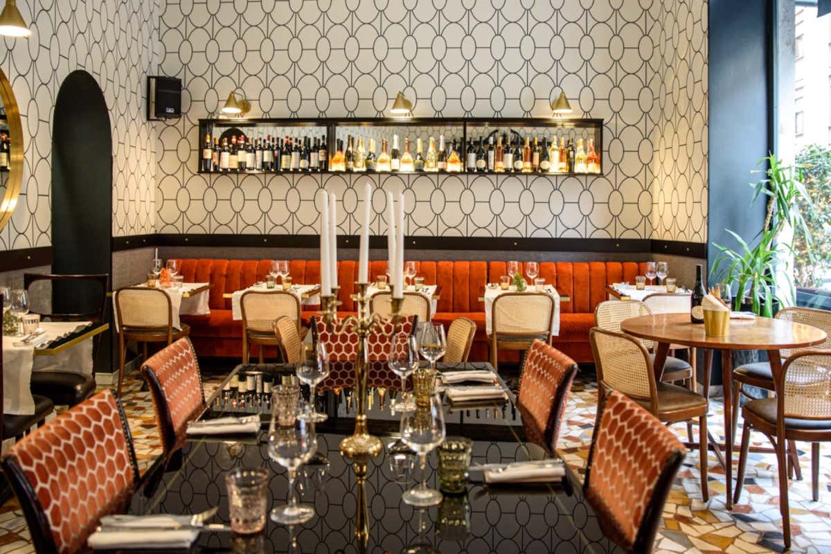 Il bistrot conserva lo stile Liberty originale ma include anche elementi moderni, come le carte da parati artistiche e i tessuti scelti, che contribuiscono a creare un ambiente accogliente. Durante la sera, la luce calda e il giardino interno con la copertura mobile offrono un’atmosfera suggestiva. L'ambiente è anche fruibile durante la stagione fredda grazie a una copertura mobile.