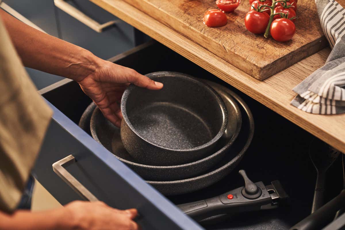 Un unico manico, removibile e antigraffio, è compatibile con tutte le forme della linea, con una portata fino a 10 kg che ne garantisce una manualità dalla presa ottimale, da fissare e rimuovere a proprio piacimento: proprio per questo le pentole della linea Torre si distinguono per la facilità con cui possono essere riposte e utilizzate in cottura.