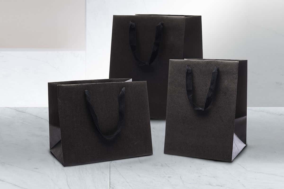 La shopper elegance in carta pregiata nera o bordeaux con manico in fettuccia di cotone è la proposta dedicata a chi fa della qualità il suo biglietto da visita. Il fondo largo e i soffietti laterali e sul fondo supportati da listelli di rinforzo garantiscono un trasporto sicuro che si presenta come una vera e propria confezione regalo. I colori discreti ed eleganti si sposano perfettamente con un servizio gourmet.