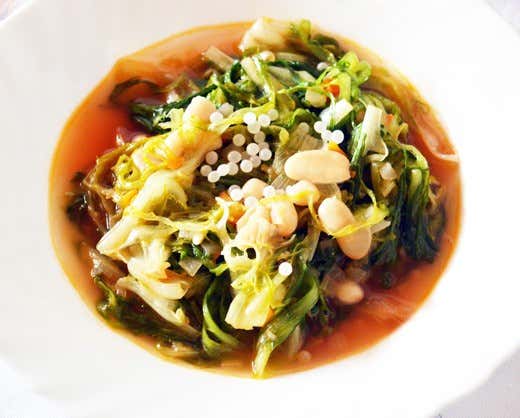 Ingredienti per 4 persone. Per il dashi: 100 gr. di funghi shiitale disidratati, 2 carote, 2 cipolle bianche, 1 gambo di sedano, 1 porro, 1 scalogno, 1 litro di acqua, 500 gr. di fagioli tondini viterbesi di Gradoli secchi, peperoncino calabrese fresco, 2 cucchiai di olio extravergine, 1 cespo di scarola riccia fresca da circa 500 gr. Per l'acqua di pomodoro: 2 cuore di bue siciliani. Per la decorazione: 1 cucchiaino di caviale di lumaca, pepe bianco.