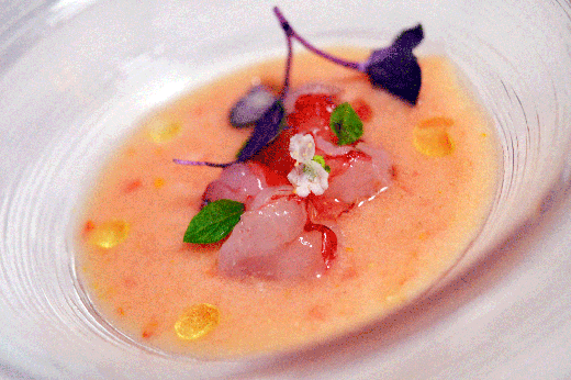 Preparazione: Scottare i cuori di bue, tenendoli poggiati all’interno di una boule di acciaio, e irrorandoli con un bric di acqua bollente. Tuffare subito i pomodori in acqua e ghiaccio, poi pelarli e passarli al mixer con altro ghiaccio, acqua minerale gasata freddissima, due gambi di sedano, qualche foglia di basilico, pepe nero, sale fino, peperoncino rosso fresco. L’obiettivo è creare una crema fredda di pomodoro che sia liscia e senza grumi, non eccessivamente densa. Da parte pulire due gamberi di media dimensione per ogni commensale, freschissimi, eliminando le teste, il budellino e il carapace. Pareggiarli con il coltello, marinarli con aceto di lamponi (in alternativa possiamo usare aceto di mele) e gocce di salsa di soia dolce. La marinatura non deve essere lunga, circa 30 minuti, il gambero non deve “cuocere” nella marinade, nè cambiare colore. Asciugare leggermente i gamberi dalla marinatura e realizzare la tartare tagliando il gambero viola a cubetti regolari.