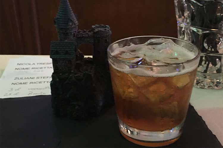 Ingredienti: 3 cl di Vermouth Drapò Gran Riserva; 2,5 cl di Braulio amaro alpino; 3 gocce di essenza di terra umida; top Soda aromatizzata al rosmarino, affumicatura al cherry.