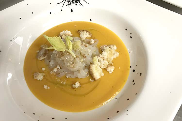 Versare la crema di zucca in un piatto fondo, porre al centro la tagliatella di seppia e decorare con del timo.