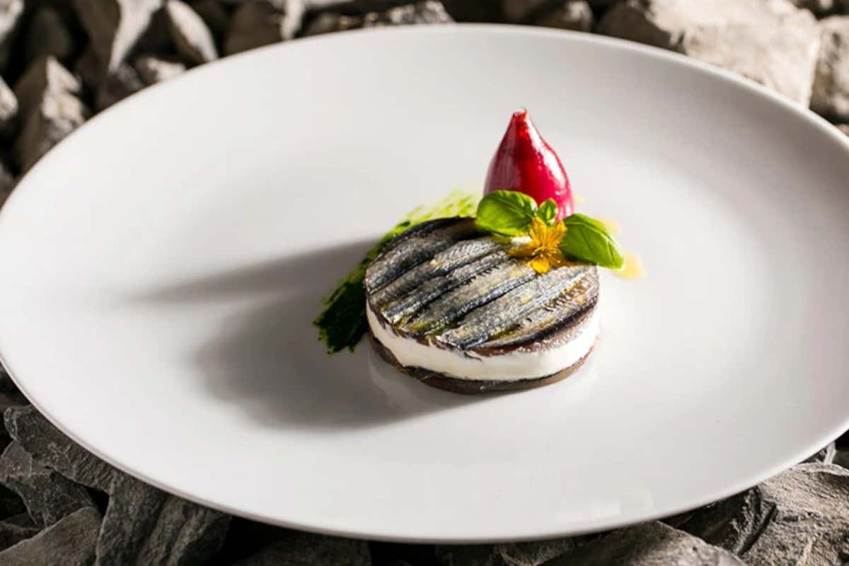 Questo piatto dello chef Oliver Glowig, del ristorante Tre Olivi di Paestum, evoca l'estate e il Mediterraneo con la freschezza delle alici e la ricchezza della ricotta di bufala. La caponatina di melanzane aggiunge una complessità di sapori che si sposa perfettamente con gli altri ingredienti, offrendo un'esperienza culinaria che celebra la semplicità e la qualità degli ingredienti di stagione.