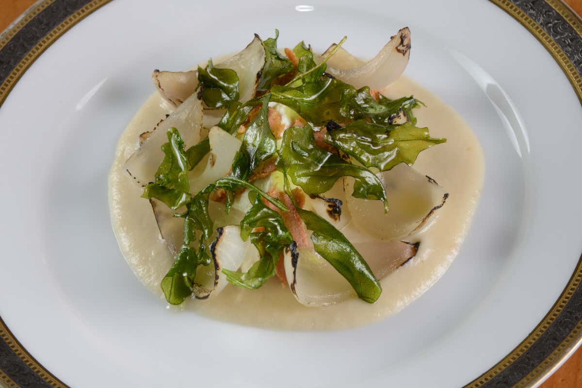 Cipolla di Albenga alla brace, caprino Pilan, bottarga di tonno e rucola fritta