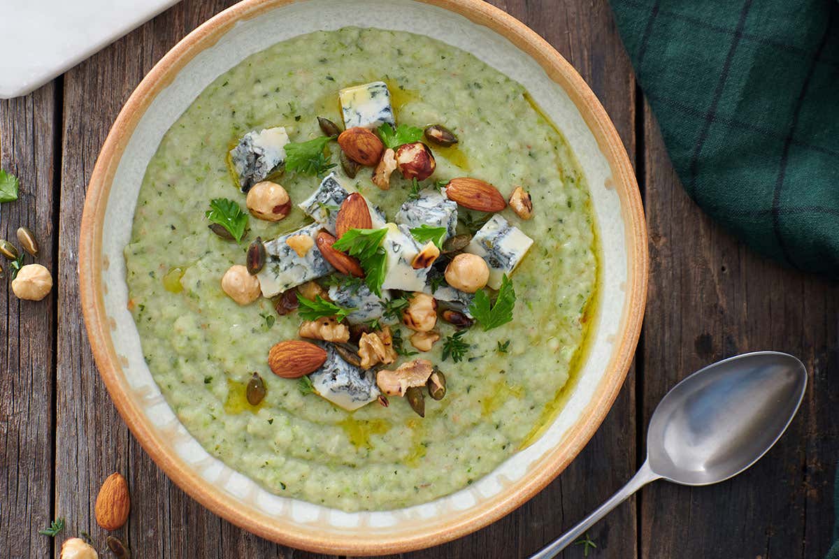 Servite la crema di minestrone guarnendola con il Gorgonzola DOP Piccante, la frutta ed i semi tostati, delle erbette fresche ed un filo d’olio evo.