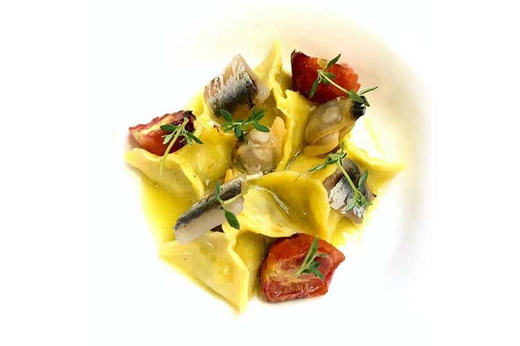 Fagottini di pasta fresca con acciughe in guazzetto di vongole veraci