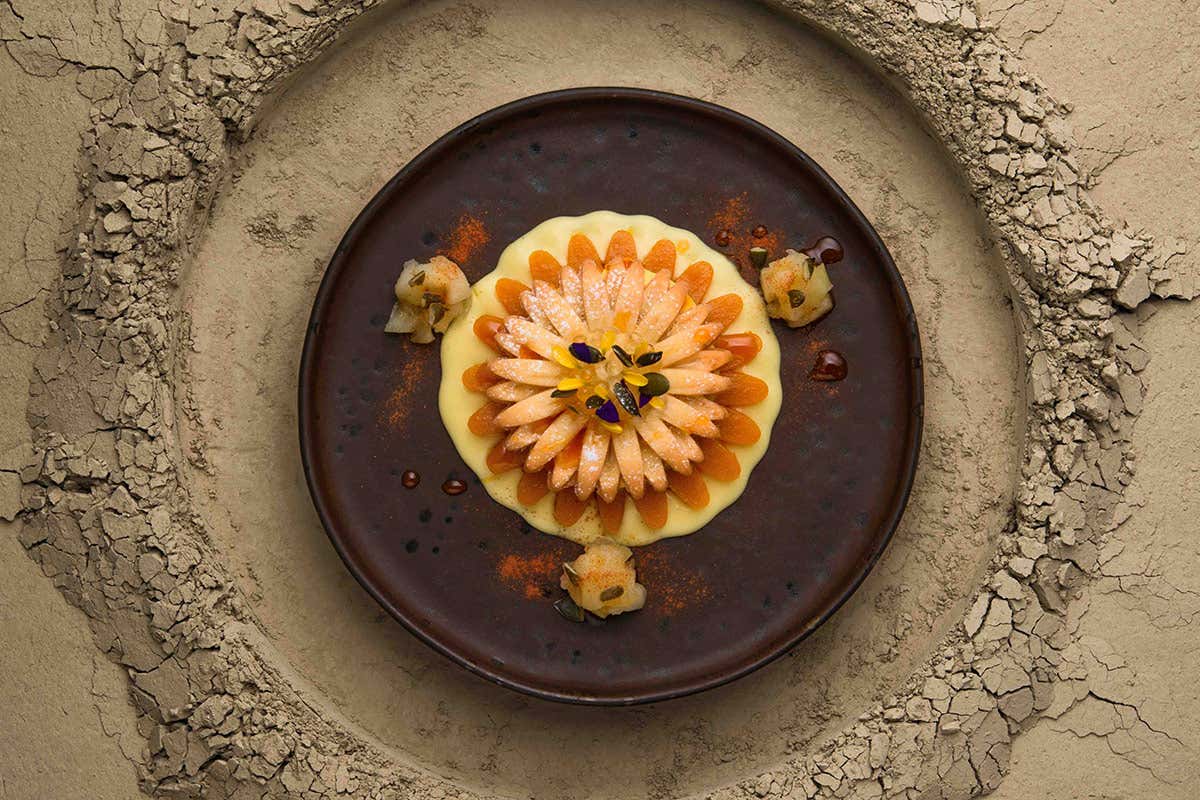 Girasole di strudel di mele con crema catalana alle mele, cannella, arancia e zenzero accompagnato da una crema inglese al passito