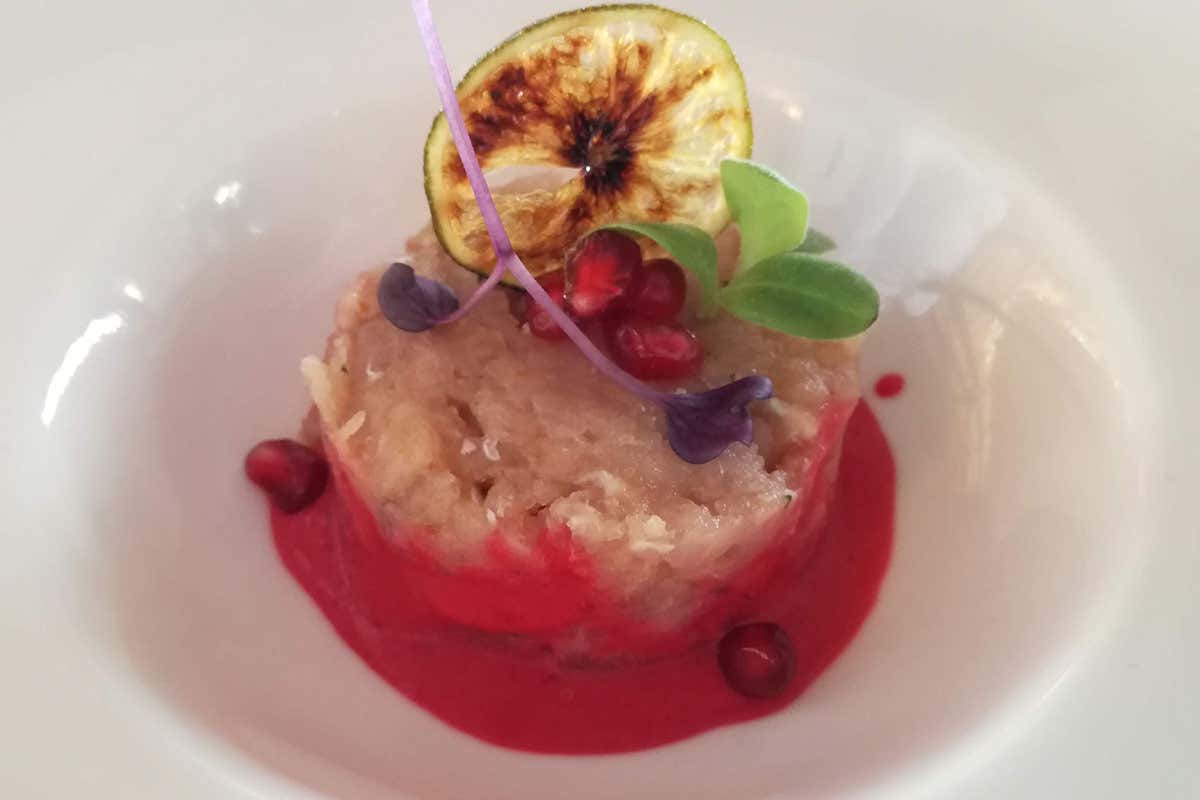 Tartara di cernia bruna marinata, bottarga di muggine e salsa ai mirtilli rossi e melagrana