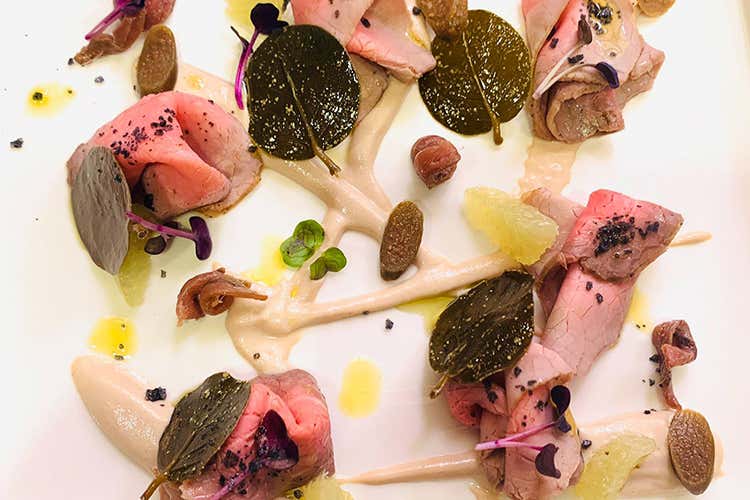 Vitello tonnato con lime, foglie di cappero, cucunci e acciughe del Cantabrico