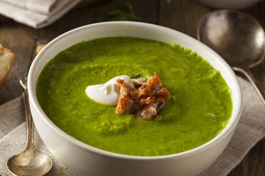 Crema di farina di piselli con pepite di ricotta e bacon croccanteIngredienti: farina di piselli o piselli secchi ridotti in polvere, olio d’oliva, ricotta, pancetta, acqua, sale, miele, foglie di sedano (hanno un aroma più intenso e sono meno fibrose).