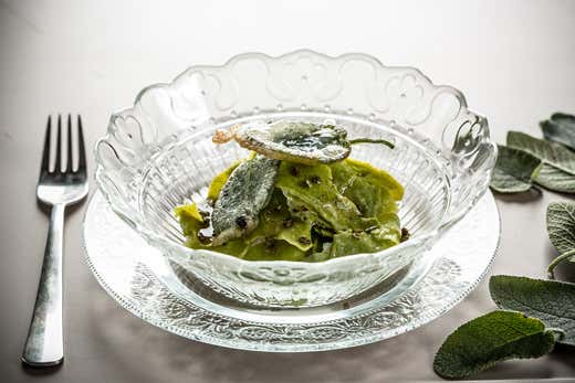 Maltagliati di piselli con paprika verde in fiocchi, salvia in pastella e burro nocciola