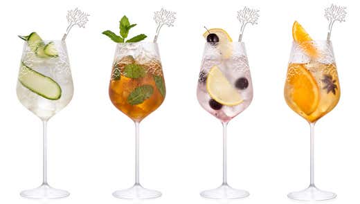 Servizio: bicchiere da Spritz, pieno di ghiaccio e riempito con uguali parti di acqua frizzante e acqua tonica.