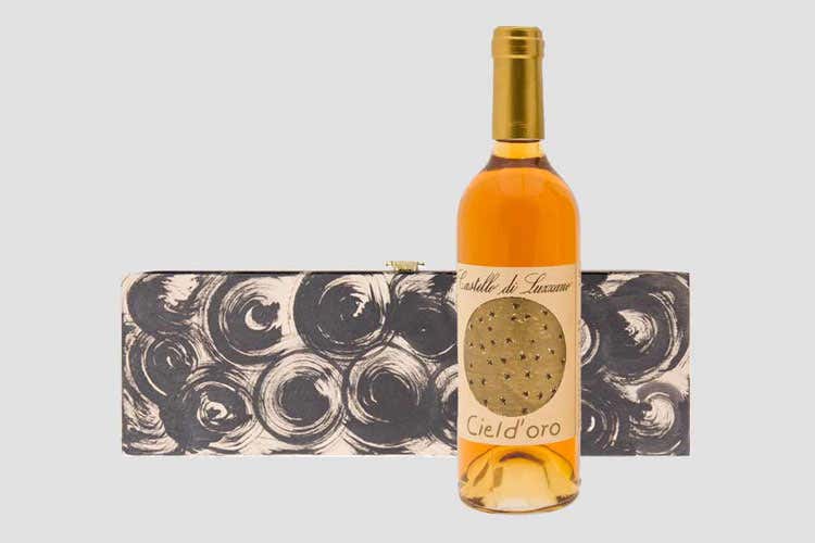 Tutte le etichette del Castello di Luzzano vengono realizzate secondo i differenti momenti emozionali che accompagnano la nascita di un nuovo vino. L’idea di stile viene trasferita anche nella scatola di legno in cui Ciel d’Oro viene confezionata, decorata a mano, esteticamente bellissima che diventa un oggetto da conservare.