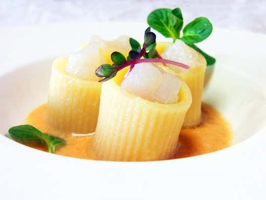 Preparazione: Pelare la carote tagliarle e tocchetti, lavare e affettare il sedano, conservando le foglie, pelare lo scalogno e le patate a pasta gialla, lavare i pomodorini. Immergere le verdure in acqua fredda e acqua di mare, portare a ebollizione, aggiungere il prezzemolo fresco, lasciar andare per 30 minuti a fiamma alta. Aggiungere gli scorfanetti freschi e lasciar cuocere il fumetto di pesce per 4 ore a fiamma bassa. Con largo anticipo immergere il carpaccio di merluzzo in un contenitore di vetro a chiusura ermetica, pieno d'acqua fredda. Aggiungere il 2 per cento di sale Halen Mon (peso compessivo del baccalà e dell'acqua, non del contenitore), unire la menta glaciale in abbondanza, lasciar riposare in frigo per 24 ore. Sciacquare il baccalà, metterlo a sgocciolare, affettarlo a tocchetti piccoli dopo aver eliminato la pelle, condirlo con l'olio all'arancia e le spezie, lasciar riposare in frigo al coperto per 2 ore. Lavare gli altri datterini, i costoluti verdi, eliminare i semi dai friggitelli, pelare la Ramata di Montoro e l'aglio rosso. Passare tutto al cutter unendo poco alla volta l'olio e qualche cubetto di ghiaccio. Prima di servire aggiungere al gazpacho due mestoli di fumetto di scorfani ormai tiepido ed emulsionare. Composizione del piatto: sul fondo di un piatto bowl, con circonferenza concava, posizionare una cucchiaiata di gazpacho di datterini con fumetto di scorfani all'acqua di mare. Disporre sulla crema i paccheri freddi che avremo cotto per 2/3 e poi lasciato in acqua e ghiaccio per qualche minuto. Riempire i paccheri con i tocchetti di Gadus Morhua. Decorare con i germogli piccantini di China Rose, la rotundifolia e infine i fiori di begonia corallina Tamaya al sapore di mela verde.