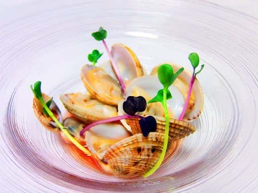 La delicatezza del tartufo della Bretagna in questa creazione è inversamente proporzionale all'aspetto quasi "primitivo" del suo guscio. Molto meno sapido di una vongola, contiene all'interno una sorta di latte che solo masticando il frutto arriva alla bocca. Una perla del mare che in questa ricetta viene esaltata da una clorofilla di sedano rosso che non è solo colore: le note di terra, straordinarie, di un prodotto slow food di eccezionale qualità, vengono valorizzate dal sapore aromatico dello zenzero, dall'acidità del bergamotto e dalle armonie fermentate dell'aceto di umeboshi, la prugna salata giapponese. I germogli di daikon e di ravanello riempiono di estetismo un antipasto d'autore.