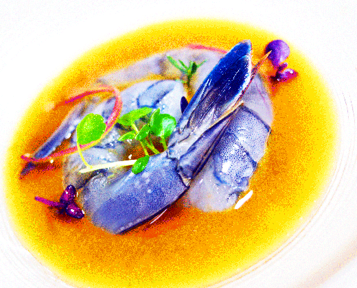 Un "viaggio" di sensazioni incredibili, di estetismo puro all'insegna del food design, di ricerca di quella semplicità zen che apre la strada all'estasi dell'assaggio. Niente altro che mare in un entrèe d'autore dove due mondi così lontani si uniscono in percorso di suggestioni, tra salinità, dolcezza e acidità, per creare emozione pura. Da una parte il bello, ma anche l'ignoto, l'etnico che affascina e che incuriosisce, ma che una volta portato alla bocca "convince" e diventa patrimonio del nostro palato. Dall'altra il sapore del Mediterraneo, con i suoi colori caldi, con una perla della Sicilia che "si vota" alla missione di quello che è il protagonista "visivo" del piatto, che tuttavia, in un gioco di "simbiosi mutualistica" nulla potrebbe senza il suo compagno di viaggio. I gamberetti blu di fondale della Nuova Caledonia, delicati ma assai gradevoli al palato, quelli che i francesi chiamano blue crevette, vengono marinati con limone agrigentino (per restare nel tema della fusione intesa come simbiosi e non come accavallamento) e un incredibile nonchè raro pepe verde vanigliato del Borneo. Ad accompagnarli alla bocca del commensale, a renderli ancora più "vicini" a noi, ci pensano dei gamberoni Rossi di Mazara di prima scelta, di cui usiamo solo le teste cariche di ambrosia, ovvero di uova, per dare vita ad una bisque come tradizione francese vuole. Bisque uguale cotti due volte: le teste "bruciano" in un fondo di finocchietto selvatico siciliano, sedano rapa e scalogno insieme al burro, a un goccio d'aceto di riso e al sakè. Ne nasce un fondo di mare incredibile e arancio-rosso che prepara i piccoli gamberi blu al grande "progetto" del piatto, per una cucina concettuale che è emozione mai fine a se stessa. Perchè l'obiettivo massimo è sempre l'eccellenza del sapore.