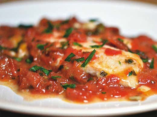 PREPARAZIONE: Ricavare abbondante acqua dai cuori di bue, ponendo i pomodori in una boule e irrorandoli con acqua bollente. Tagliarli a metà e metterli a sgocciolare su colini coperti da garza alimentare. Sfilettare con cura il san pietro, seguendo l’acuminata linea dorsale. Eviscerarlo e lavarlo sotto l’acqua corrente creandosi una cavità all’altezza delle branchie (le interiora son tutte nella testa). Ricavare due filetti grandi, belli e compatti a cui va lasciata la pelle, splendida e buona da mangiare. Preparare un fondo di aglio, scalogno, olio, prezzemolo tritato (il gambo) e peperoncino. Rosolare il san pietro solo dal lato della pelle, sfumare con il vino bianco. Mettere da parte il san pietro. Ricavare l’acqua dalle vongole in un ampio tegama al coperto. Filtrarla. (Non buttiamo le vongole, che utilizzare le vongole per un’altra preparazione). Preparare un concassè con i pomodori da sugo grandi scottandoli sempre con acqua bollente, tuffandoli nell’acqua fredda, pelandoli, ed eliminando buccia e semi. Tagliare la polpa a pezzetti e metterla a rosolare nel fondo di aglio olio e peperoncino (a cui avremo tolto l’aglio e lasciato lo scalogno, ma che sarà intriso degli “umori” del pesce arricchito dall’acidità del vino bianco). Unire l’acqua di vongole al fondo di aglio e olio, lasciar andare per qualche minuto a fuoco medio. Unire poi il concassè e farlo leggermente decomporre sempre a fiamma media. Ottenere quindi questo composto perfetto, naturalmente sapido (senza l’uso di un solo milligrammo di sale). Aggiungere il filetto di pesce nel condimento e portarlo a cottura a fiamma delicatissima. Unire una nota di pepe bianco. Servire il pesce “mimetizzato” dal sughetto all’acqua pazza. Decorare con prezzemolo fresco e profumato