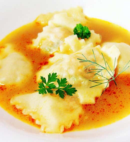 PREPARAZIONE: Eviscerare le triglie, squamarle con attenzione e lavarle delicatamente sotto un filo di acqua corrente. Preparare un abbondante trito di sedano, carota, cipolla, prezzemolo fresco (solo il gambo). Lavare le patate, lasciando però la buccia. Abbattere le triglie. Quando saranno ancora freddissime, farle soffriggere a fiamma alta con le verdure, e aggiungere ghiaccio in abbondanza. Ricavare l’acqua dai pomodori costoluti cuore di bue. Filtrarla. Far cuocere il fumetto di triglia almeno due ore. Poi filtrare. Ridurre almeno della metà ricavando un “concentrato” di triglia rossa, arricchirlo con l’acqua del pomodoro, ridurre ancora, aggiungere il pepe bianco. Preparare un dashi leggero di patate che va fatto in tre momenti. Prima l’alga kombu deve reidratare due ore in acqua, dopo essere stata pulita con un panno umido. Eliminare la schiumetta che si forma, portare l’acqua con l’alga all’interno a bollore per 10 minuti abbondanti. Filtrare e aggiungere il katsuobushi. Lasciar bollire altri 10 minuti e lasciar riposare per altri 5. Filtrare nuovamente e aggiungere le patate. Far cuocere il brodo finchè le patate non saranno morbide e avranno conferito la loro nota di amido al composto. Preparare una bisque con il carapace e la testa dei gamberoni. Unire i due brodi con le gocce di bisque. Lasciar ridurre ancora fino a ottenere un vero e proprio concentrato. Preparare la sfoglia dei ravioli molto sottile, fino a misura 2, lavorando la farina con il succo di limone e i soli albumi. Riempire i tortelli con la tartare di gamberi rossi marinati con gocce di limone e lapsang souchong polverizzato, con un trito di talli di zucchine appena scottati e ridotti a coltello. Ricavare dei tortelli quadrati con l’apposito stampo. Riempirli con la farcia di gamberi e talli. Cuocere i tortelli in cottura passiva (dopo aver portato a bollore l'acqua spegnere la fiamma e immergervi i ravioli). Composizione del piatto: disporre i tortelli in un piatto bowl, irrorarli con il brodo davanti agli occhi del commensale con una teiera. Irrorare solo il brodo con gocce di olio evo formando delle bollicine. Decorare con prezzemolo riccio e finocchietto selvatico fresco.