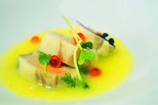PREPARAZIONE: Per preparare il Fegato di coda di rospo con lardo su crema di mela verde, iniziare eviscerando la rana pescatrice e mettendo da parte il fegato. Dividere la coda dalla testa, quindi eliminare la pelle e separare la carne (che non verrà utilizzata per questa preparazione) dalla lisca. Preparare un brodo di pesce unendo due gambi di sedano, le carote e la cipolla ad un fondo di olio extravergine di oliva. Inserire anche la testa e la lisca della rana pescatrice e coprire con circa un litro di acqua. Lasciar cuocere il brodo per 2 ore, schiumare, filtrare e tenere da parte. Pulire il fegato della rana pescatrice eliminando, con un coltello, le parti contenenti sangue. Lavarlo delicatamente immergendolo in acqua fredda. Condire il fegato da ambo i lati con sale, olio e aceto di mele. Prendere le fettine di lardo e avvolgerle intorno al fegato, quindi posizionarsi sopra ad un foglio di pellicola trasparente, coprire con foglie di alloro e chiudere la pellicola formando una sorta di “caramella”. Portare nuovamente a bollore il brodo, spegnere il fuoco e immergervi il fegato chiuso nella pellicola, coprendo con il coperchio e lasciandolo cuocere fino a quando il brodo non sarà diventato freddo. Al termine della cottura, recuperare il fegato e riporlo in abbattitore o nel congelatore. Preparare una crema fredda frullando le mele verdi con due gambi di sedano, ghiaccio, aceto di mele e un pizzico di pepe bianco. Eliminare la pellicola trasparente e affettare il fegato di rana pescatrice. Infine disporre alla base del piatto la crema fredda di mela verde e adagiarvi sopra il fegato di coda di rospo. Servire con le uova di salmone reale.