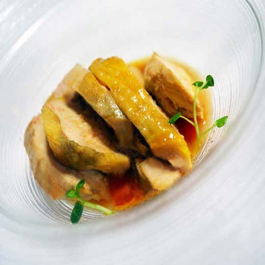 Due mondi così lontani eppure così vicini, accomunicati dallo stesso percorso logico: la salinità naturale. Uno straordinario petto di faraona vive le emozioni del sapore vero del brodo di pesce della tradizione senza perdere la sua identità. Carne e pesce insieme, in un piatto preparato in chiave umami, senza un granello di sale aggiunto, dove a fare da perfetto ago della bilancia c'è il pomodoro, dal potere chimico straordinario, capace di valorizzare la sapidità delle materie prime e neurotrasmetterla.